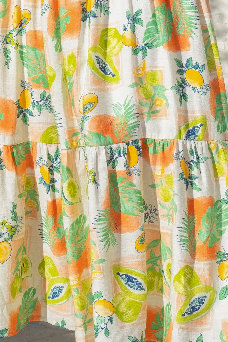 - printed - maxi length - cutout back - tier ruffles - elastic waistband - adjustable shoulder straps - tie back - sleeveless - lined MODEL- HEIGHT 5'9" BUTST 32" WAIST 24 1/2" HIP 35"